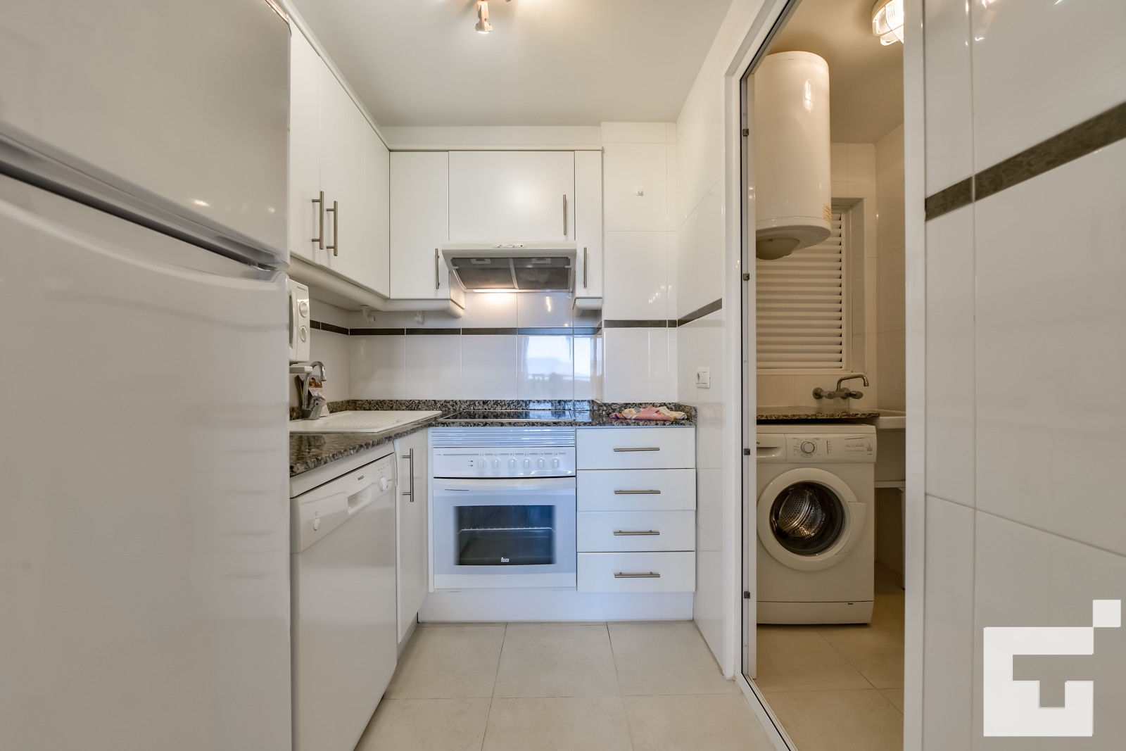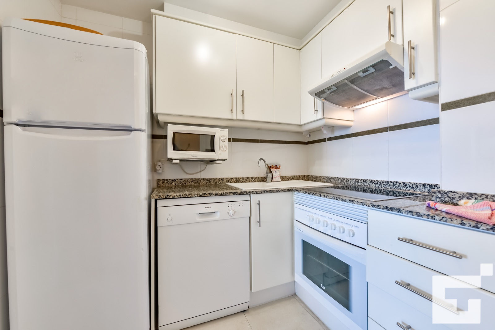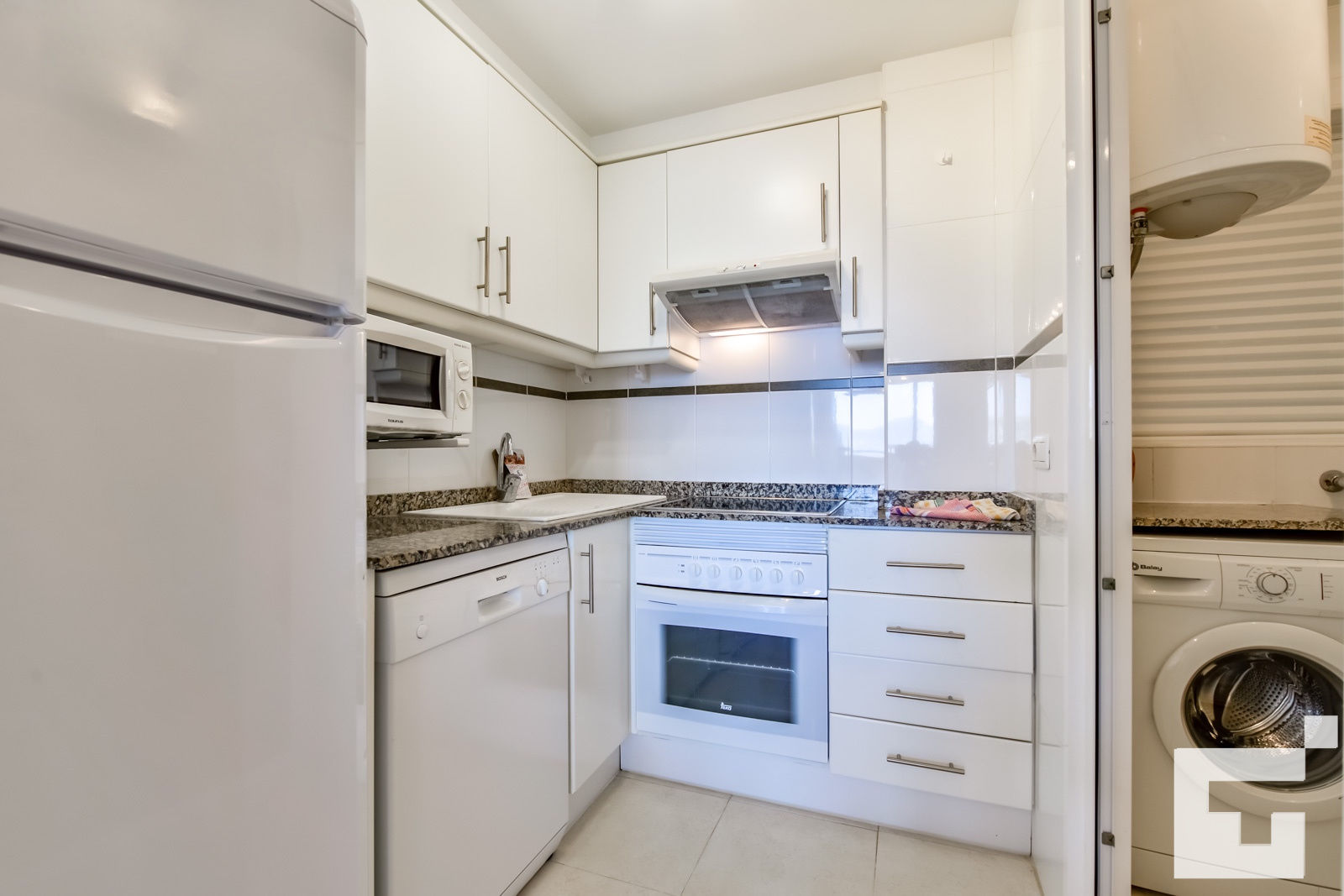 • cocina con vitrocerámica eléctrica, horno eléctrico, microondas, lavavajillas, refrigerador, congelador, cafetera, batidora, tostadora y exprimidor