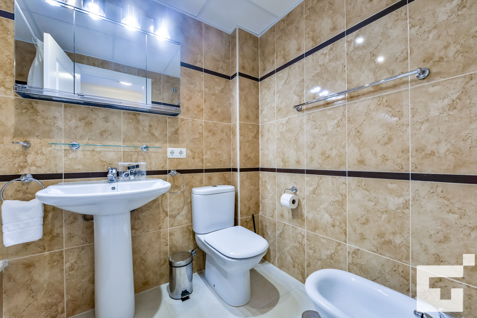 • baño con lavabo individual, bañera, bidet y toilettes