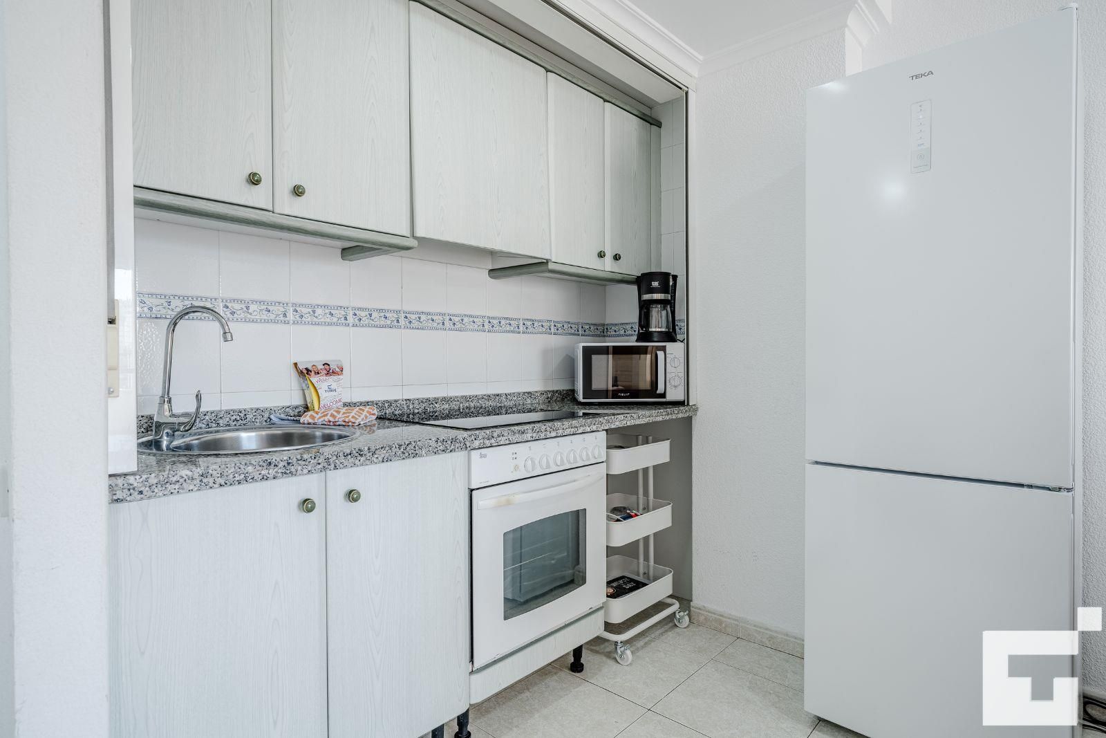 • cocina con placa eléctrica, horno eléctrico, microondas, refrigerador, congelador, cafetera, batidora, tostadora y exprimidor