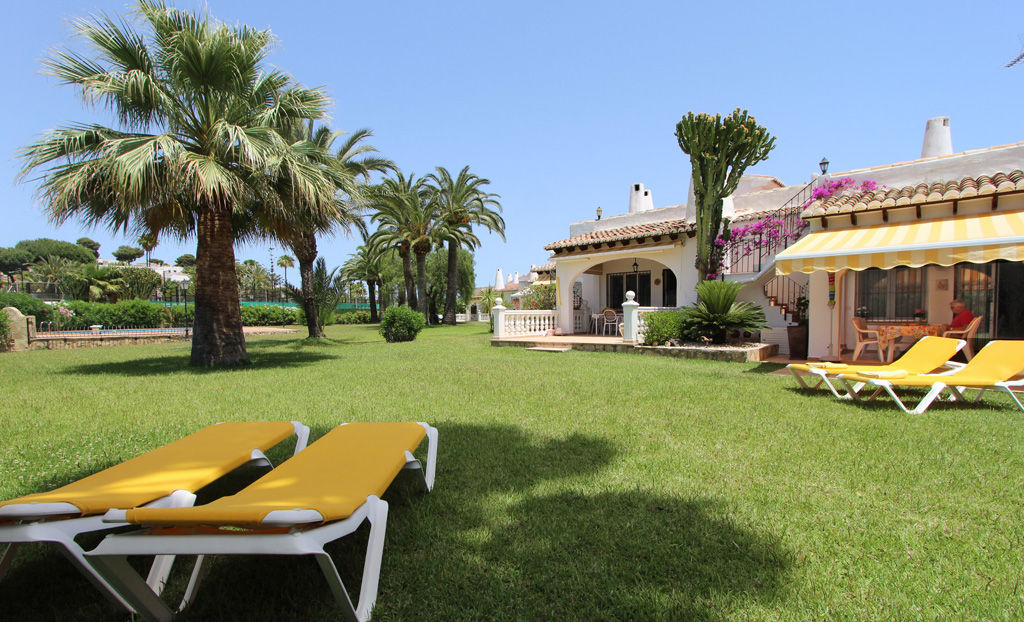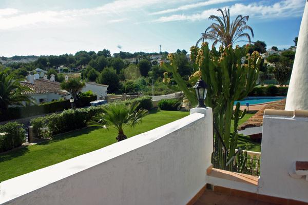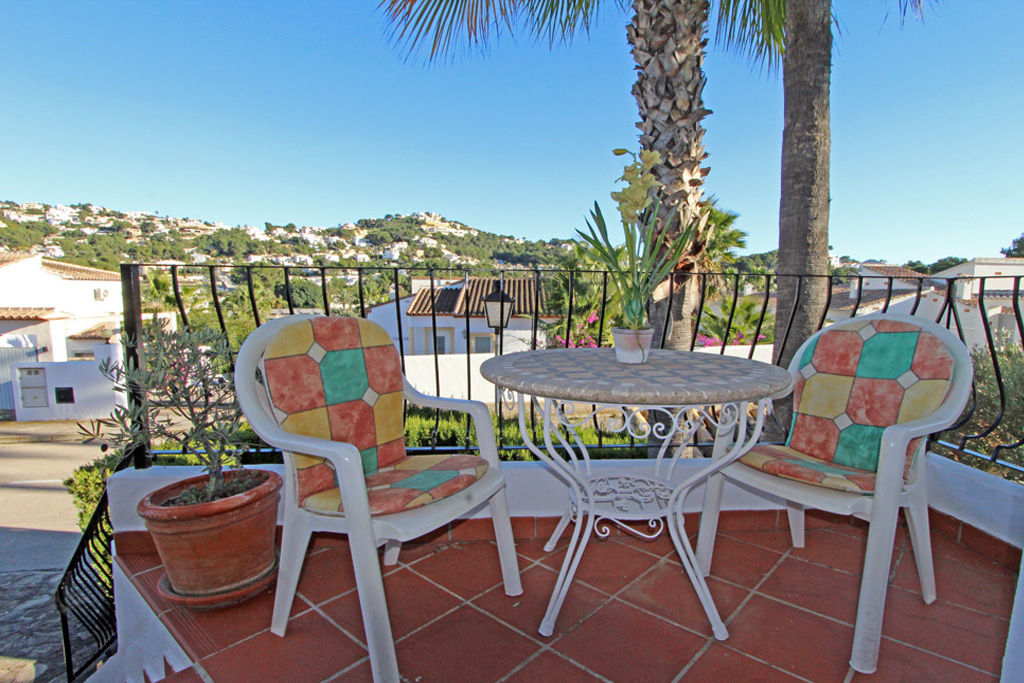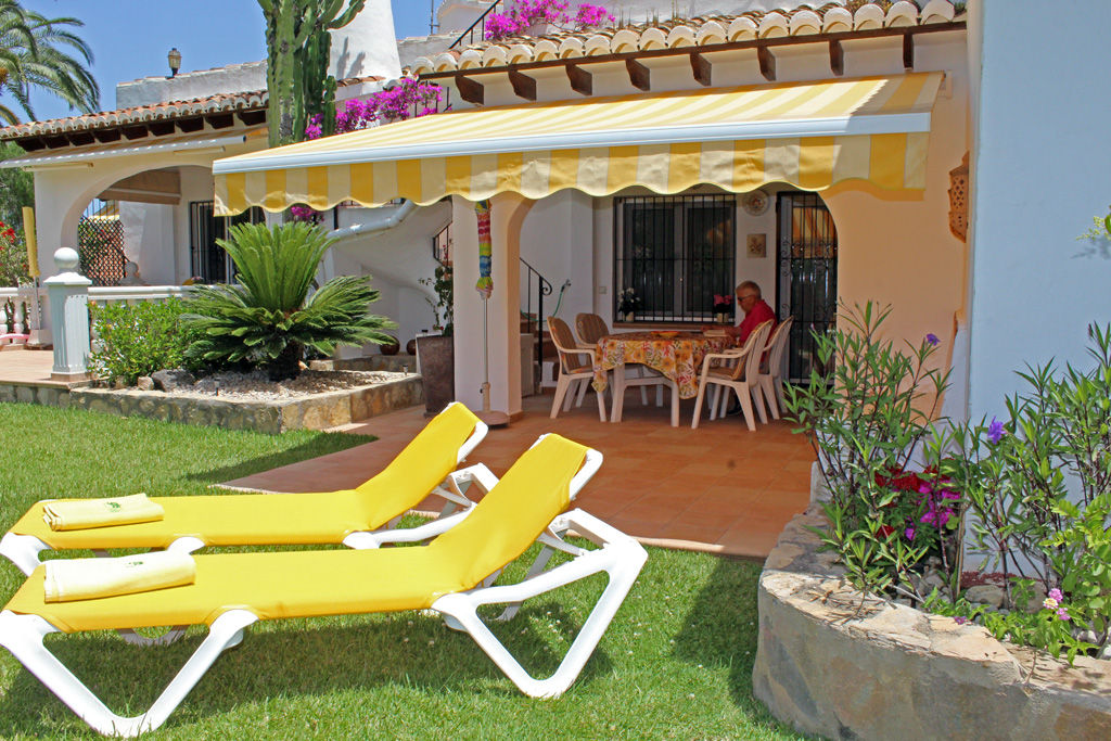 Casa de vacaciones con piscina comunitaria en Moraira, Costa Blanca, España, para 4 personas. La casa está situada en un complejo vacacional que cuenta con bar y restaurante, en una zona residencial, cerca de tiendas y de una cancha de tenis, y a 3 km de la playa de Ampolla.