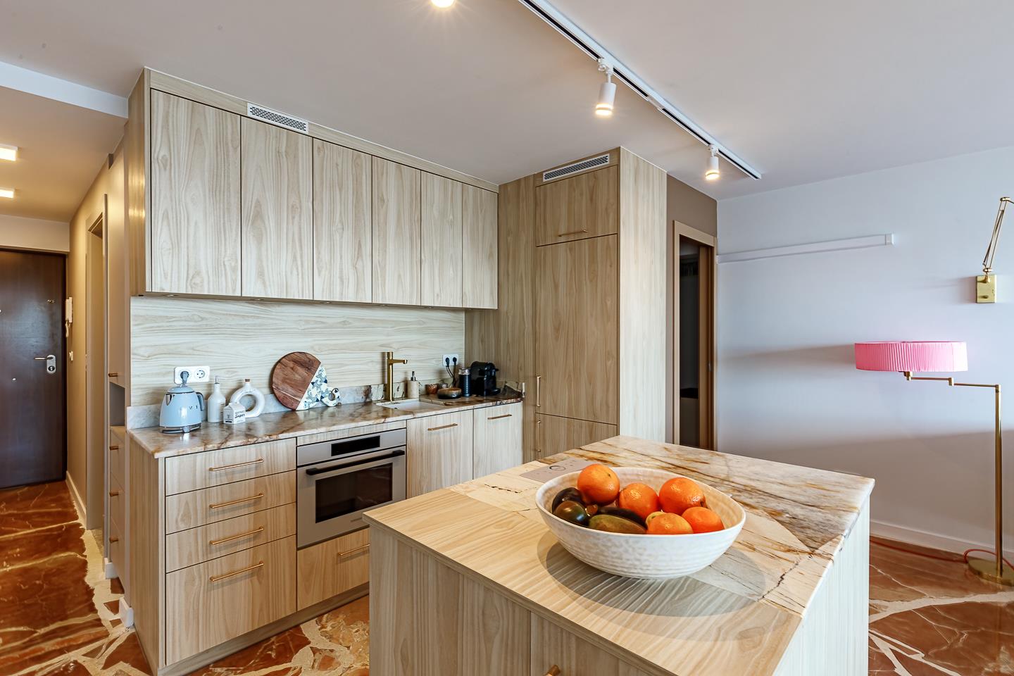 • cocina abierta con placa eléctrica, horno eléctrico, microondas, lavavajillas, frigorífico-congelador, cafetera, hervidor eléctrico, batidora, tostadora y exprimidor