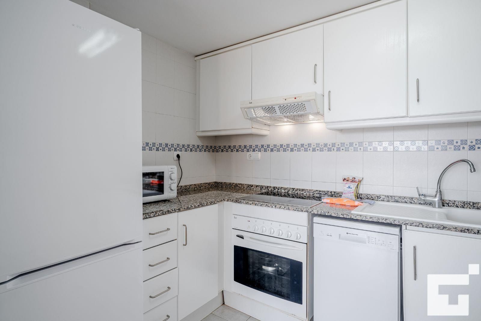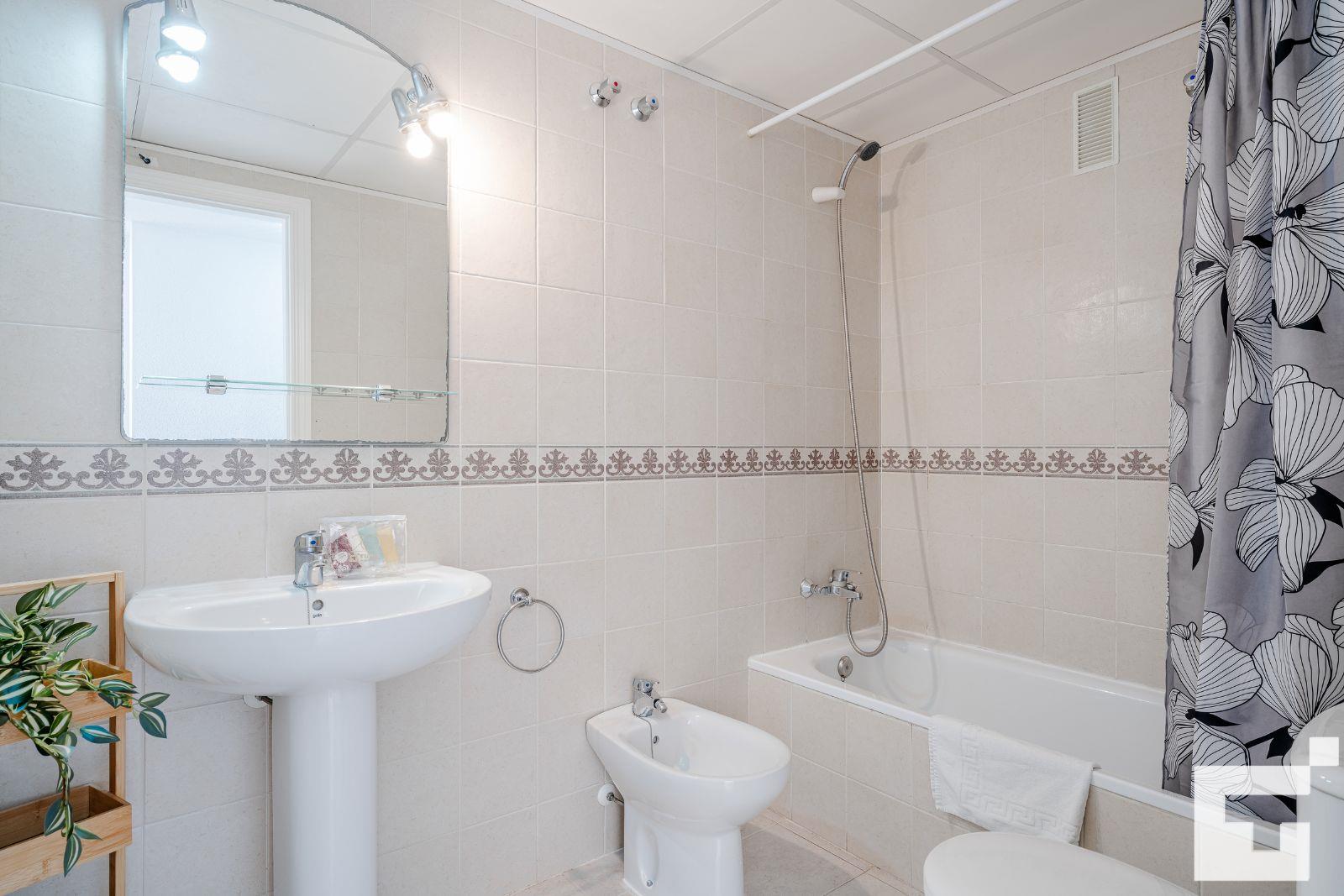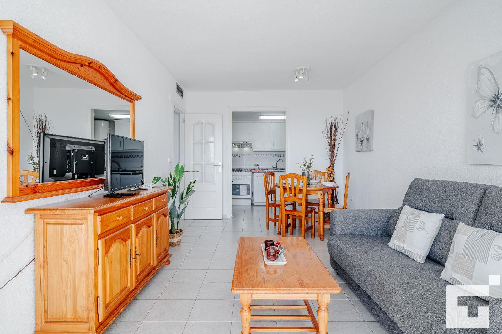 El apartamento cuenta con 1 dormitorio y 1 baño. El alojamiento ofrece privacidad, un jardín comunitario con césped y árboles, y maravillosas vistas a la playa y al mar. Su comodidad y la proximidad a la playa, áreas comerciales y opciones de entretenimiento hacen de este un excelente apartamento para pasar sus vacaciones en España con familia o amigos.