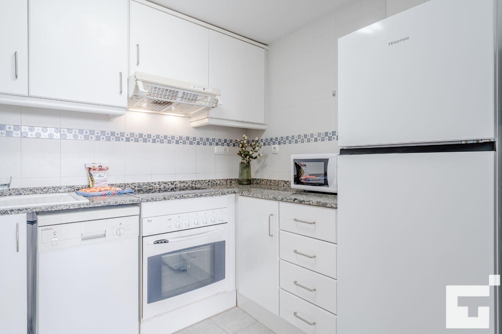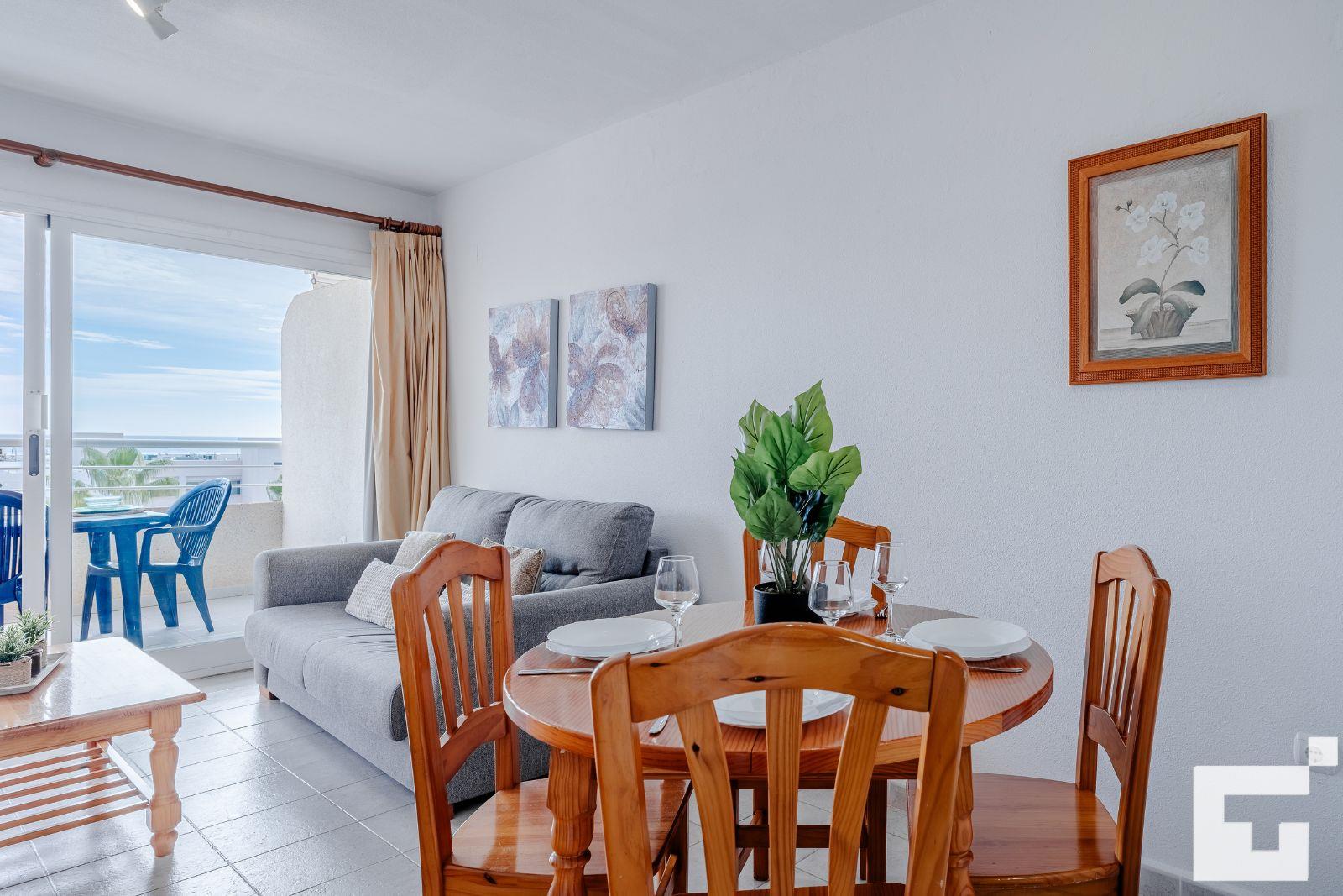 El apartamento cuenta con 1 dormitorio y 1 baño. El alojamiento ofrece privacidad, un jardín comunitario con césped y árboles, y maravillosas vistas de la playa y el mar. Su comodidad y la proximidad a la playa, zonas comerciales y vida nocturna hacen de este un excelente apartamento para disfrutar de sus vacaciones en España con familia o amigos.