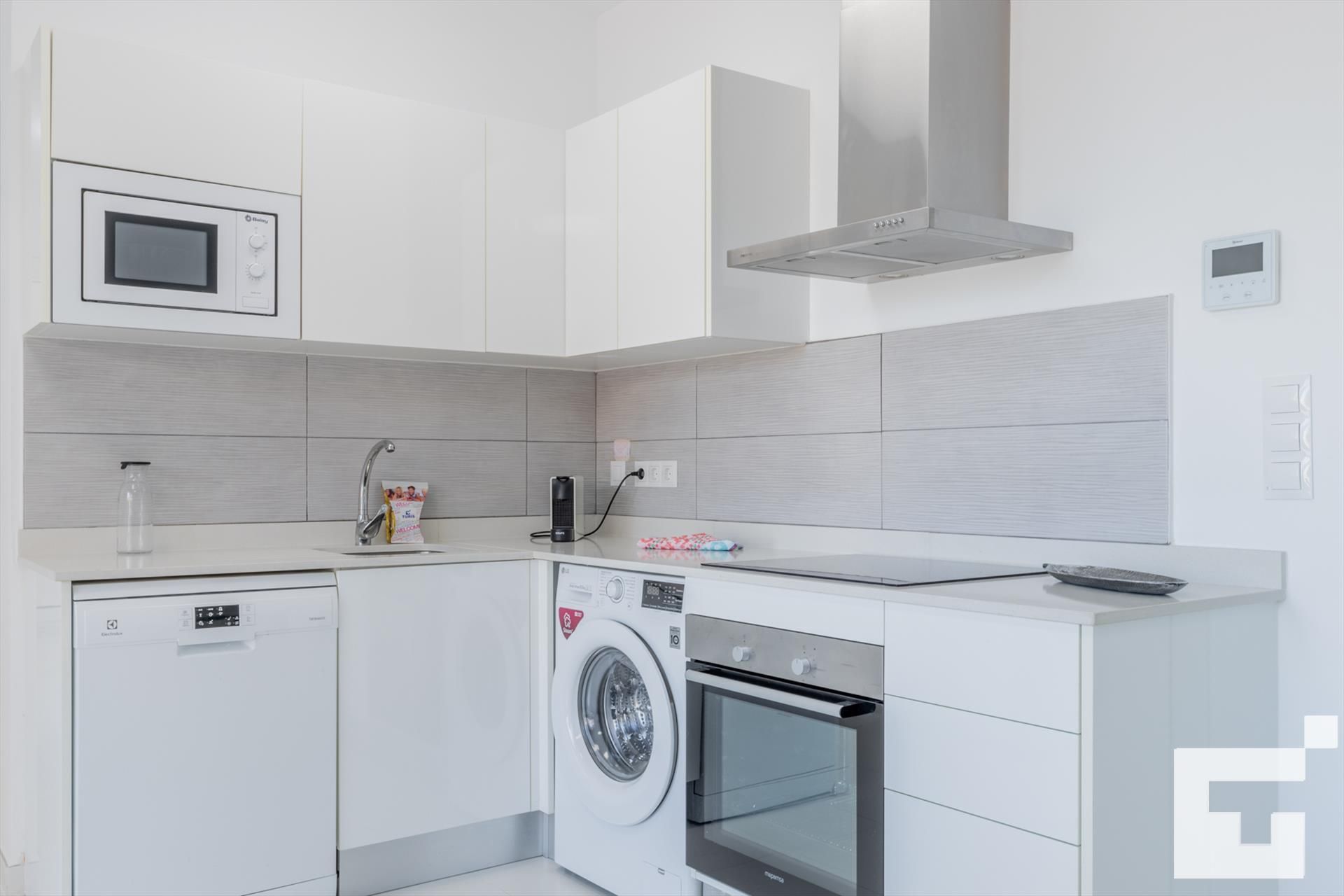• cocina abierta con vitrocerámica, horno eléctrico, microondas, lavavajillas, refrigerador, congelador, cafetera, batidora, tostadora y exprimidor