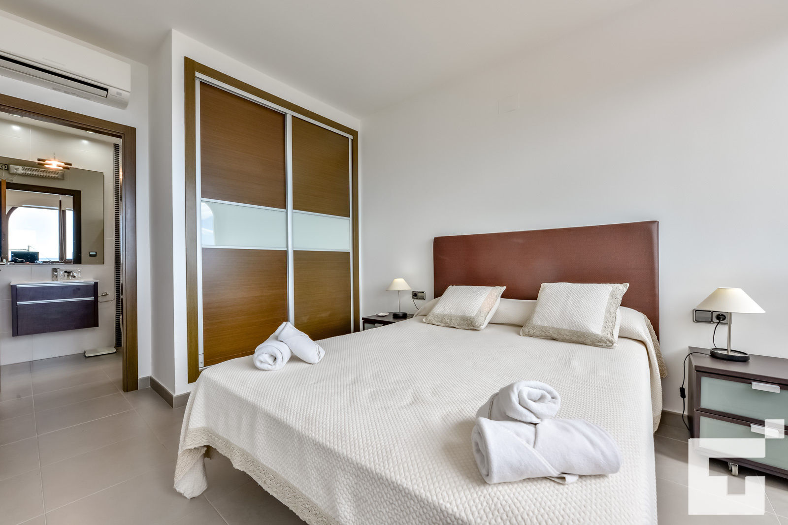 • dormitorio con aire acondicionado, cama doble y baño en suite
