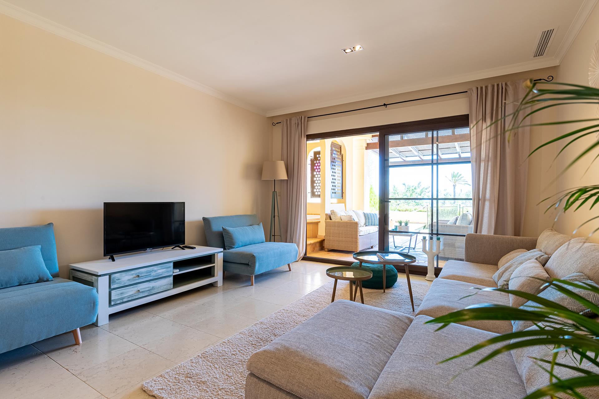 The apartment has 2 bedrooms and 2 bathrooms. The accommodation offers privacy, a beautiful lawned garden, a communal garden with trees, and beautiful views of the bay, the sea, the garden, and other buildings. Its comfort and the proximity to the beach, places to shop, sports activities, entertainment facilities, and places to go out make this an ideal apartment to spend your holidays in Spain with family or friends.