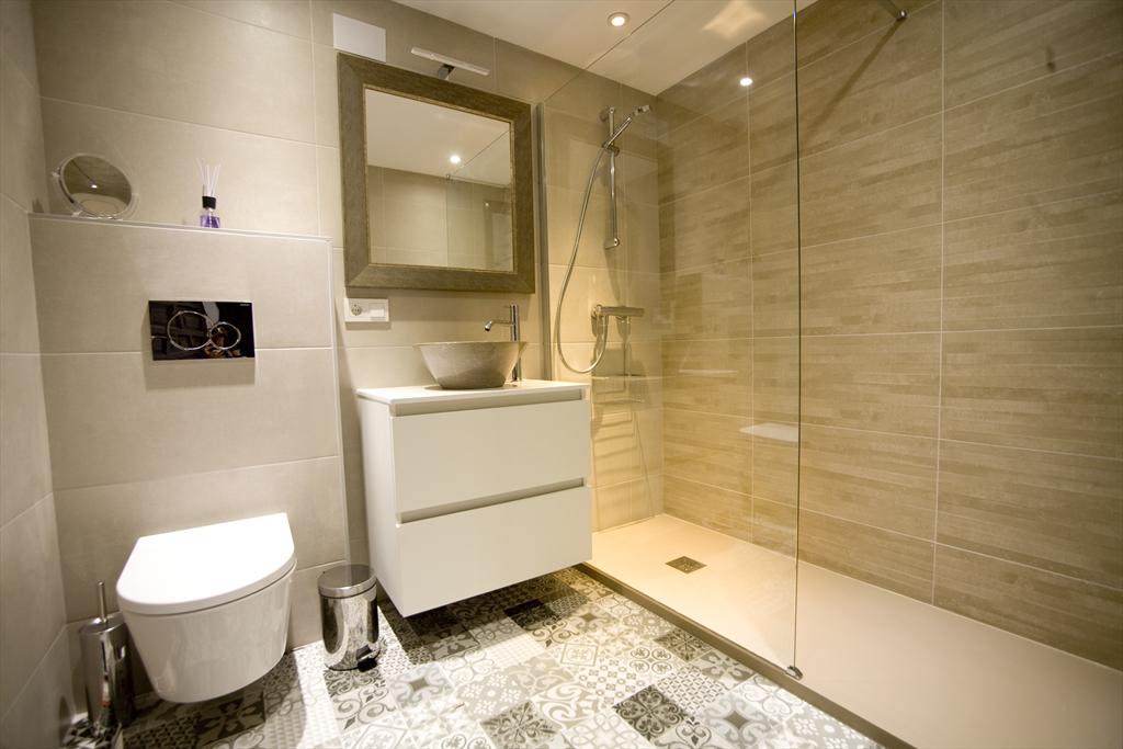- en-suite bathroom with single washbasin, shower and toilet