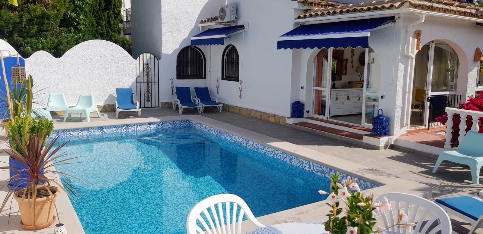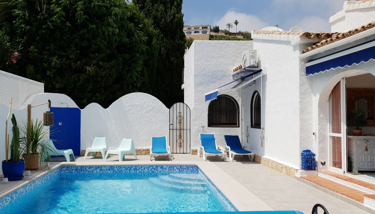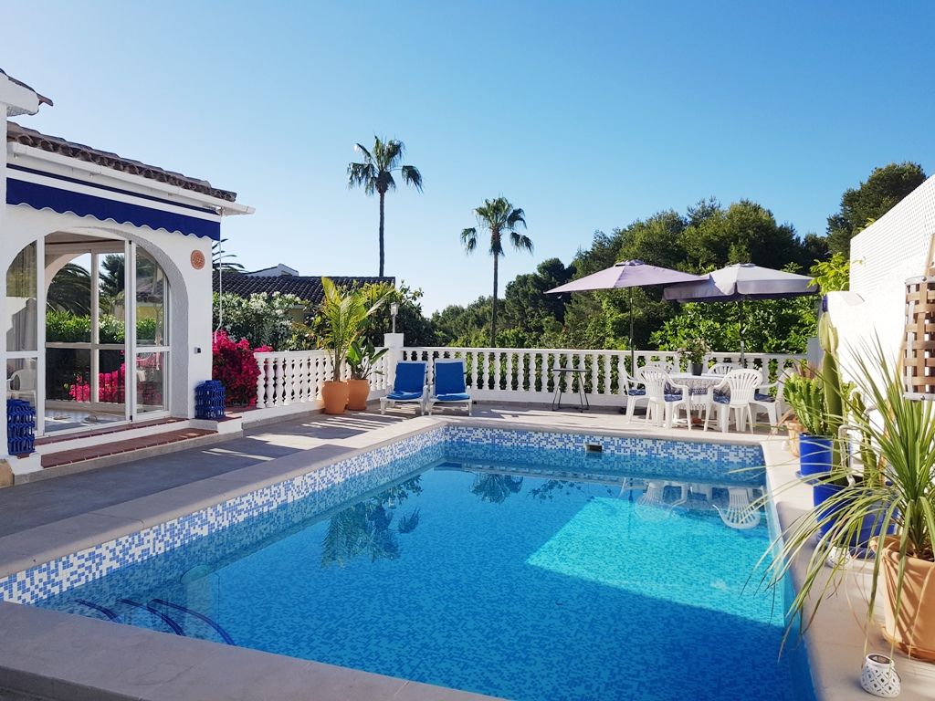 Comfortable holiday house in Benissa, Costa Blanca, Spain with private pool for 6 persons. The house is situated in a coastal and residential area and at 5 km from Moraira. The house has 3 bedrooms and 2 bathrooms, spread over 2 levels. The accommodation offers privacy, a garden with gravel and trees, a beautiful pool and a view of the valley. Its comfort and the vicinity of the beach make this a fine holiday house to spend your holidays in Spain with family or friends.
