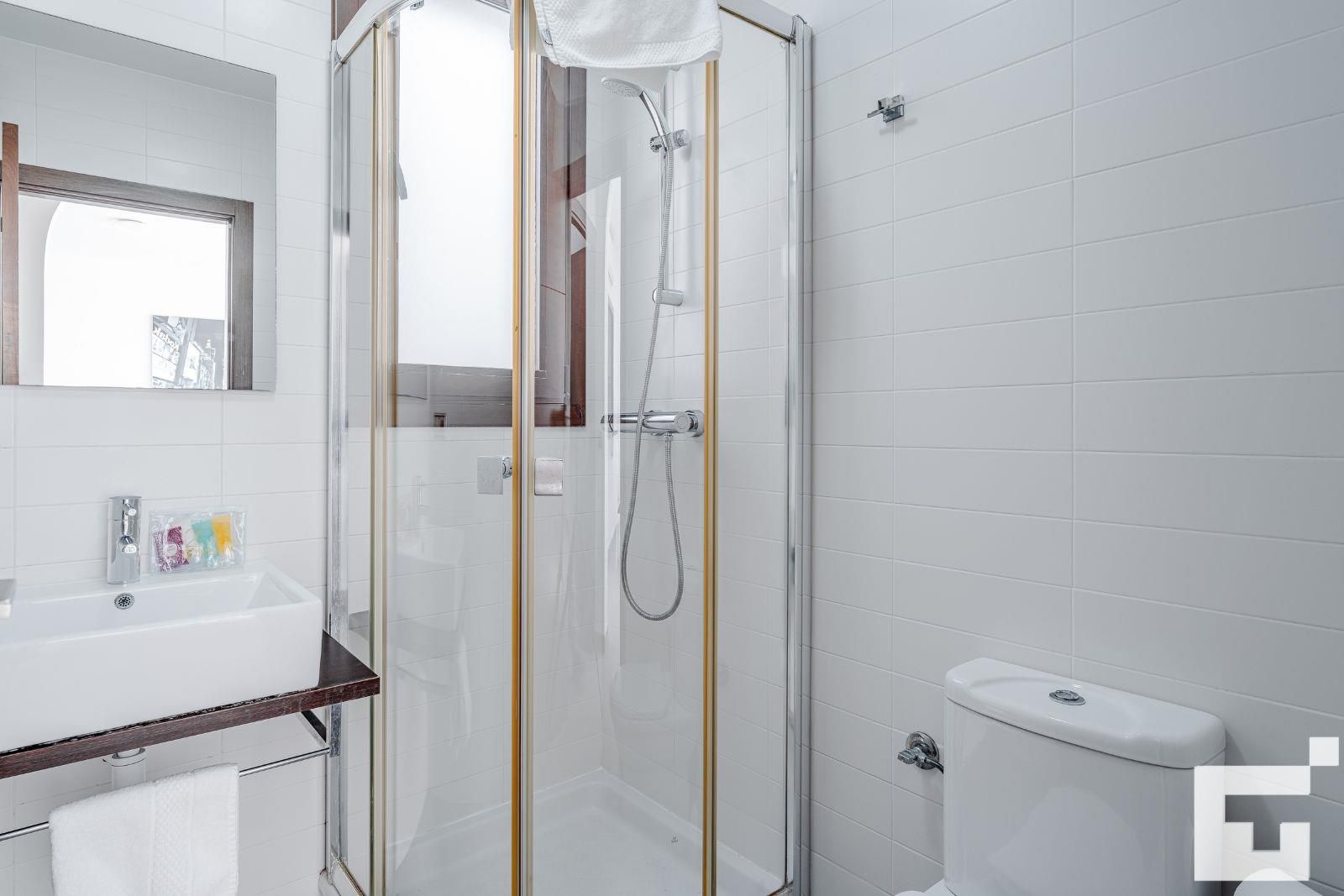 • bathroom with single washbasin, shower and toilet