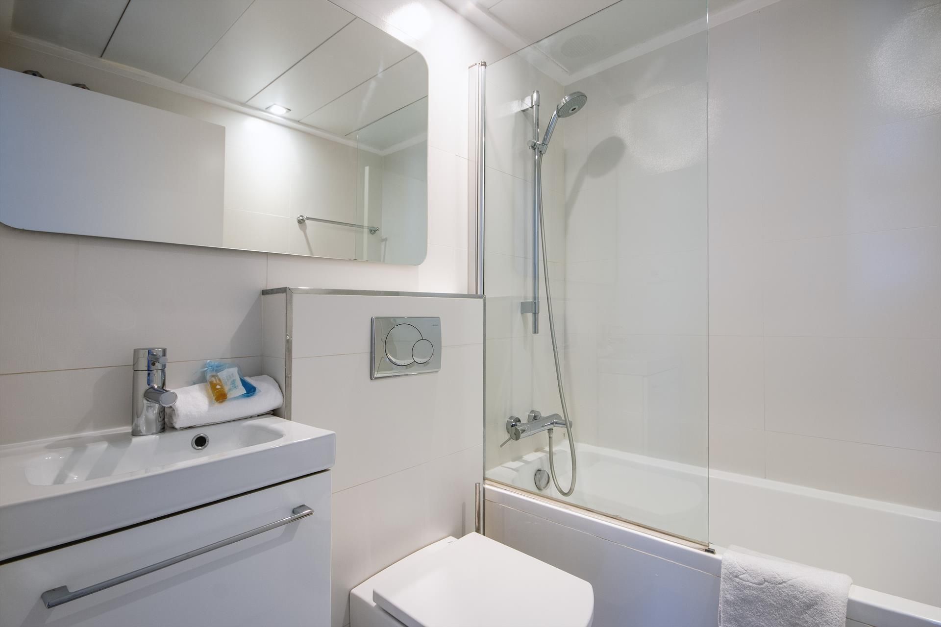 • bathroom with single washbasin, shower and toilet