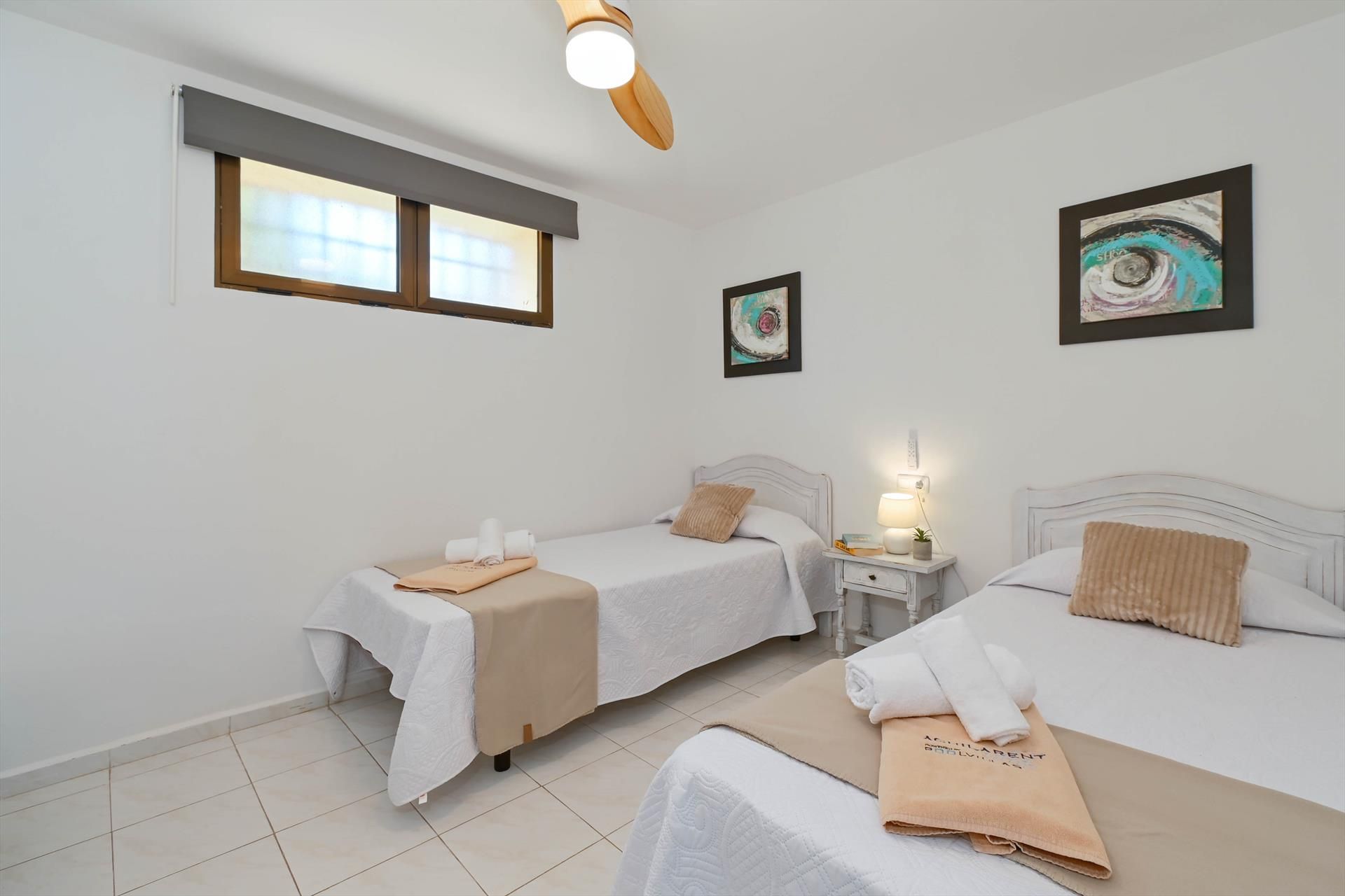 • bedroom with 2 single beds (measuring 190 by 80 cm) and fan