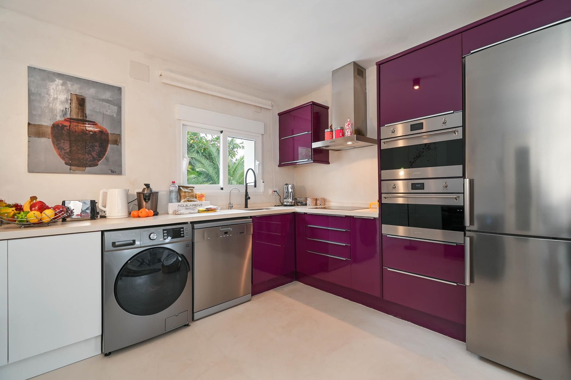 • open kitchen with electric hob, electric oven, microwave, dishwasher, refrigerator, freezer, coffee machine, electric kettle, mixer, toaster, and juicer