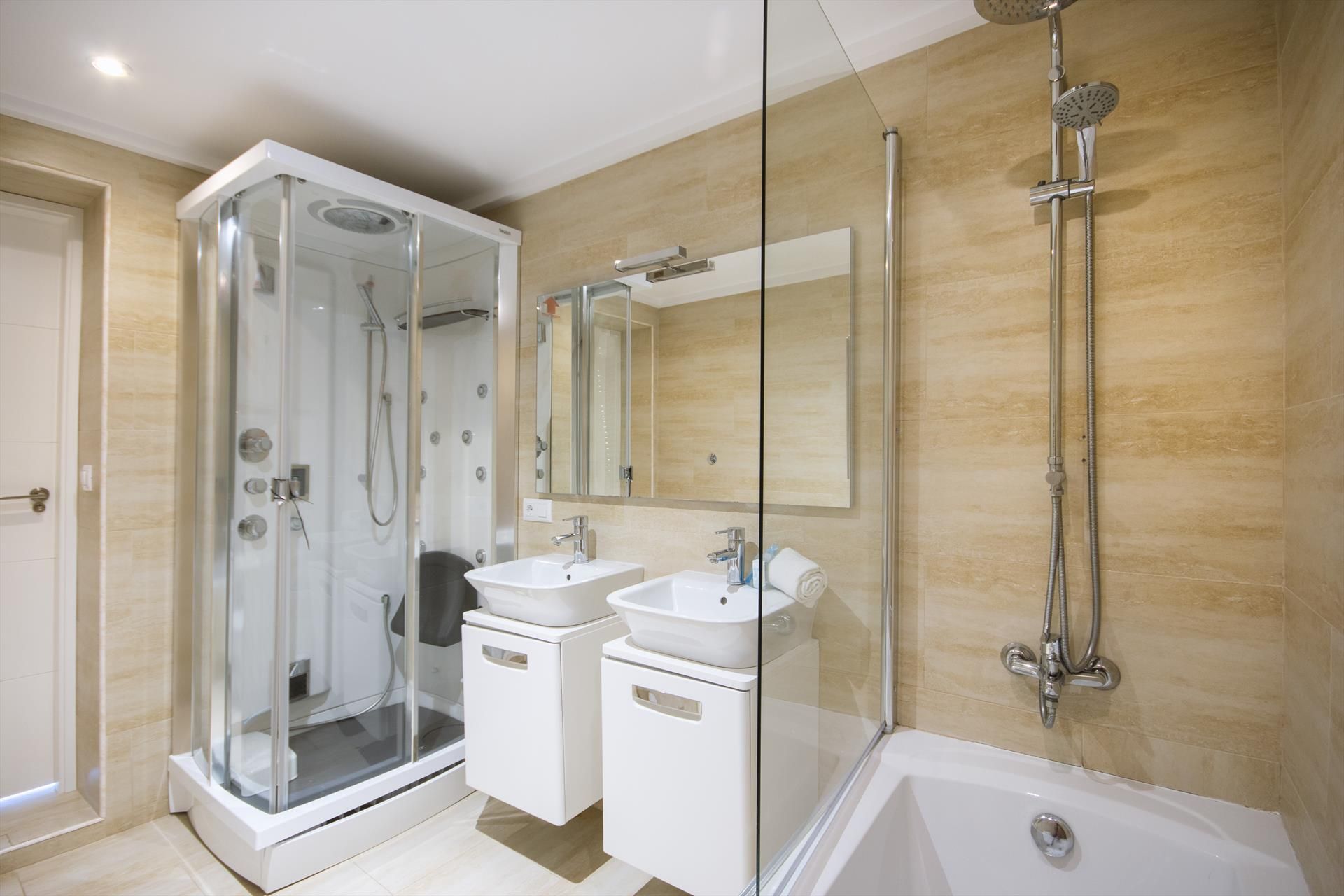 • en-suite bathroom with double washbasin, bath, shower and toilet
