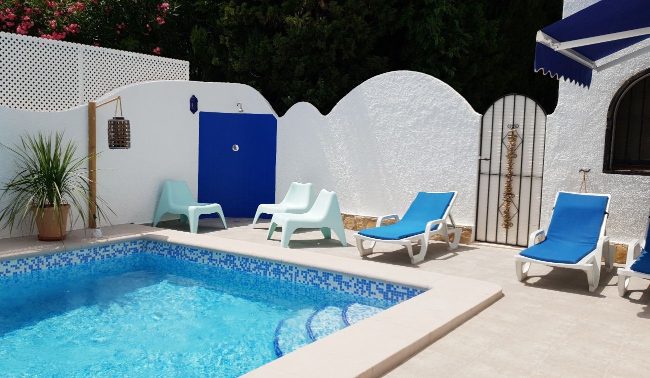 Location de vacances comfortable à Benissa, Costa Blanca, Espagne avec piscine privée pour 6 personnes. Le logement est situé dans une région côtière et résidentielle et à 5 km de Moraira. La location a 3 chambres à coucher et 2 salles de bain, réparties sur 2 étages. Le logement offre de l'intimité, un beau jardin avec gravier et d´arbres, une belle piscine et une vue sur la vallée. Le comfort et le voisinage de la plage rendent cette location de vacances un logement convenable pour passer les vacances en Espagne avec votre famille ou vos amis.