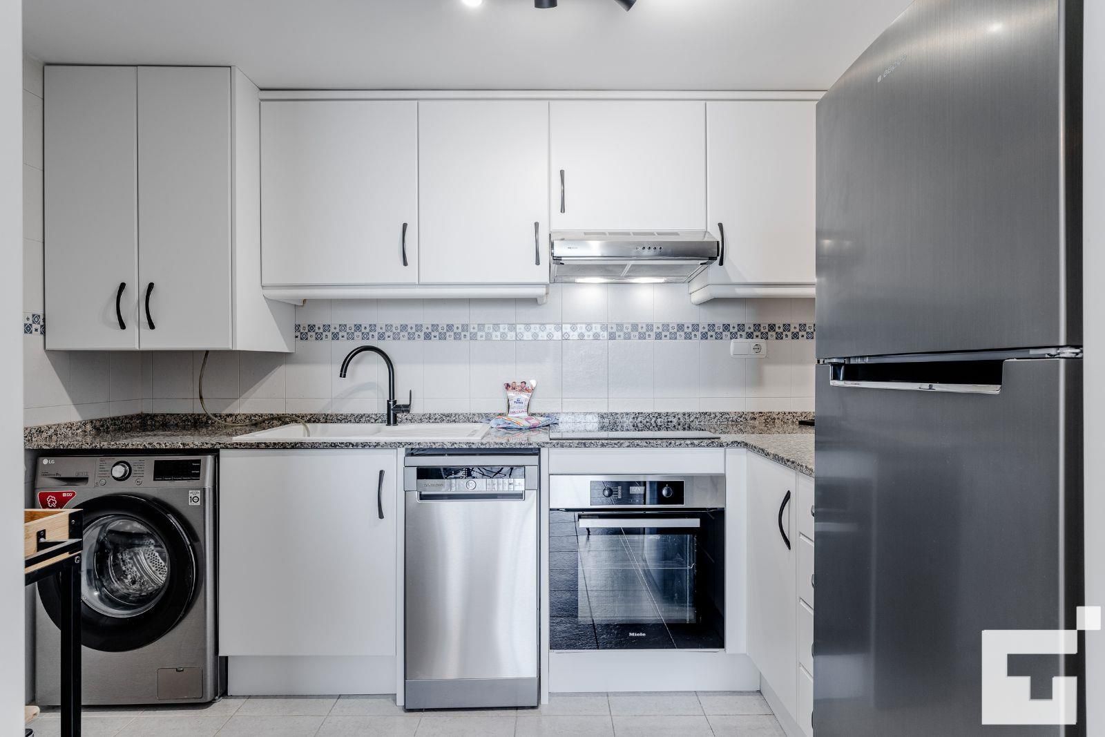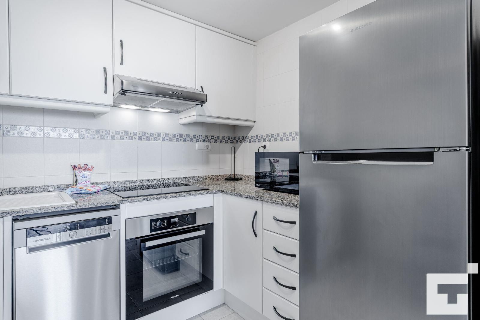 • cuisine ouverte avec plaque de cuisson électrique, four électrique, micro-ondes, lave-vaisselle, réfrigérateur, congélateur, cafetière, mixeur, grille-pain et presse-agrumes