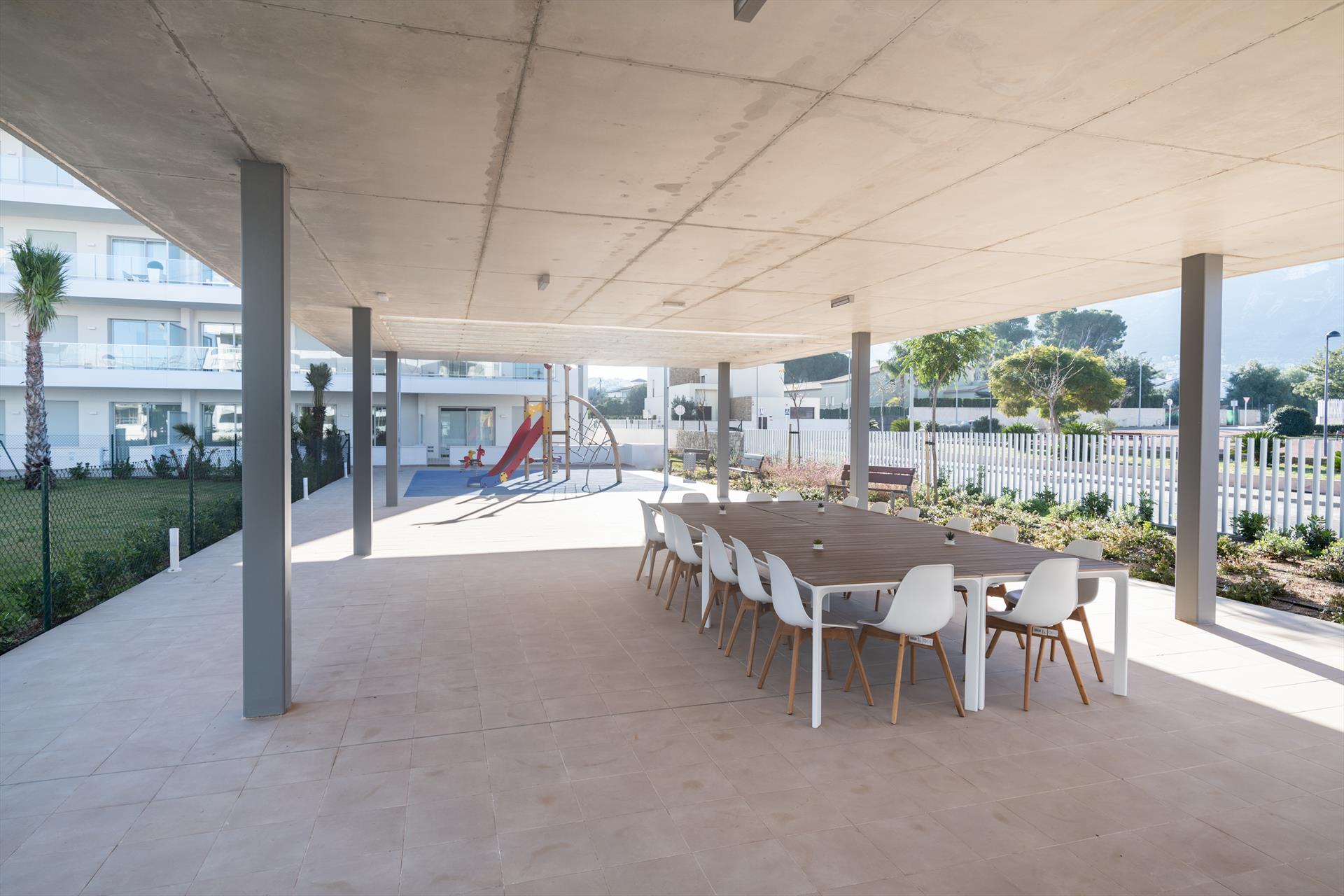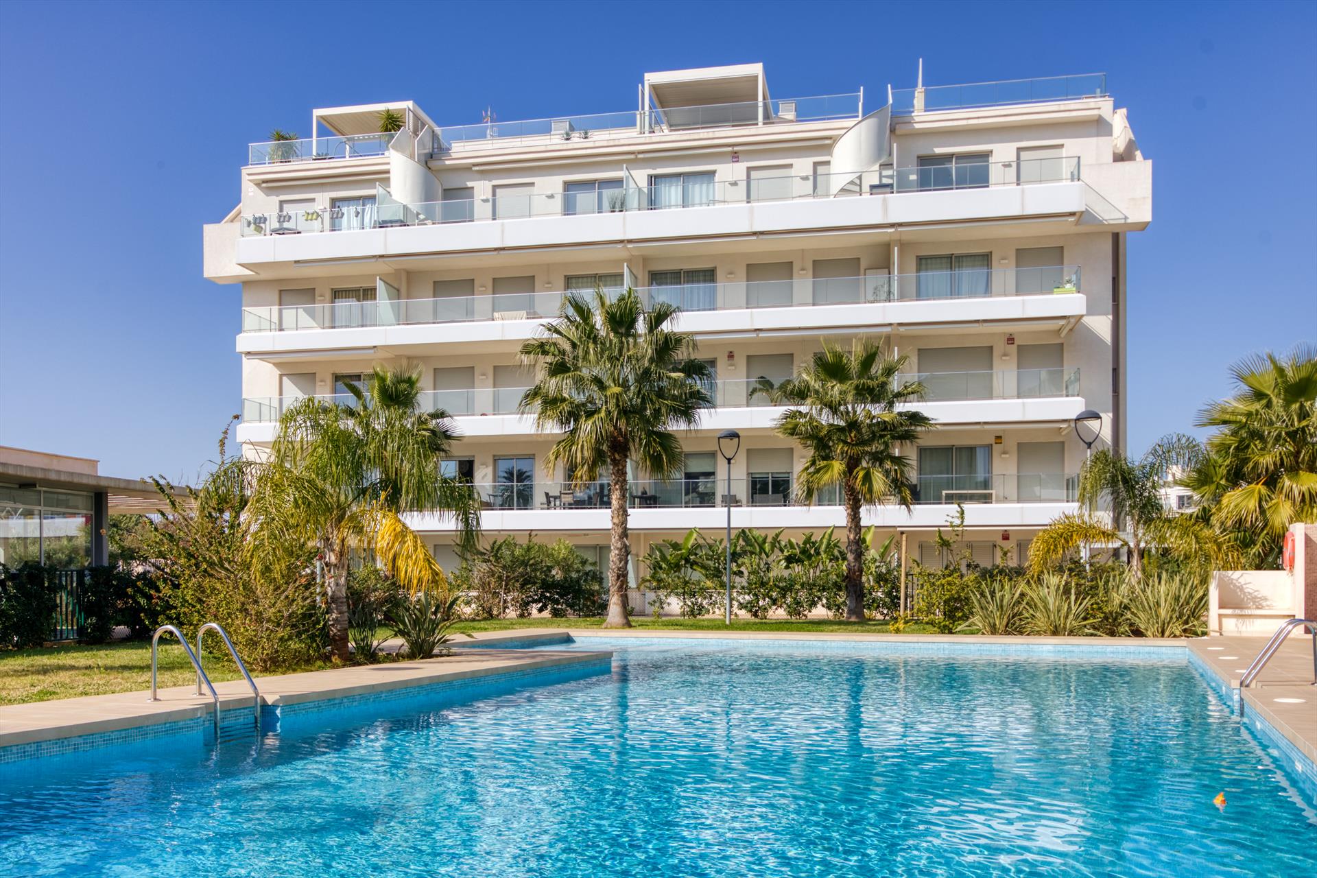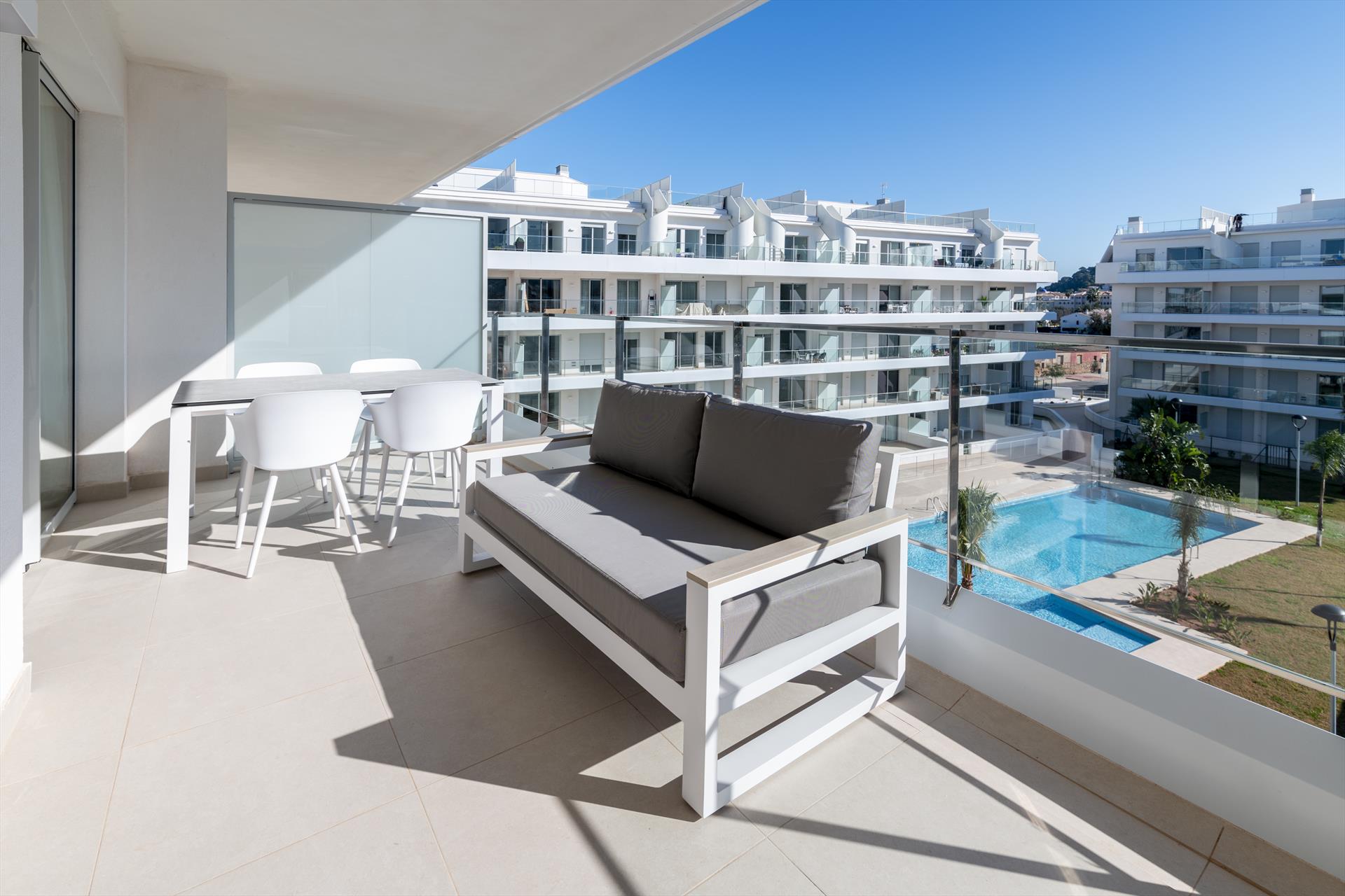Appartement moderne et confortable avec piscine commune à Denia, Costa Blanca, Espagne, pour 4 personnes. L'appartement est situé dans une zone urbaine en bord de mer et se trouve à 1 km de la plage de Marineta Casiana.