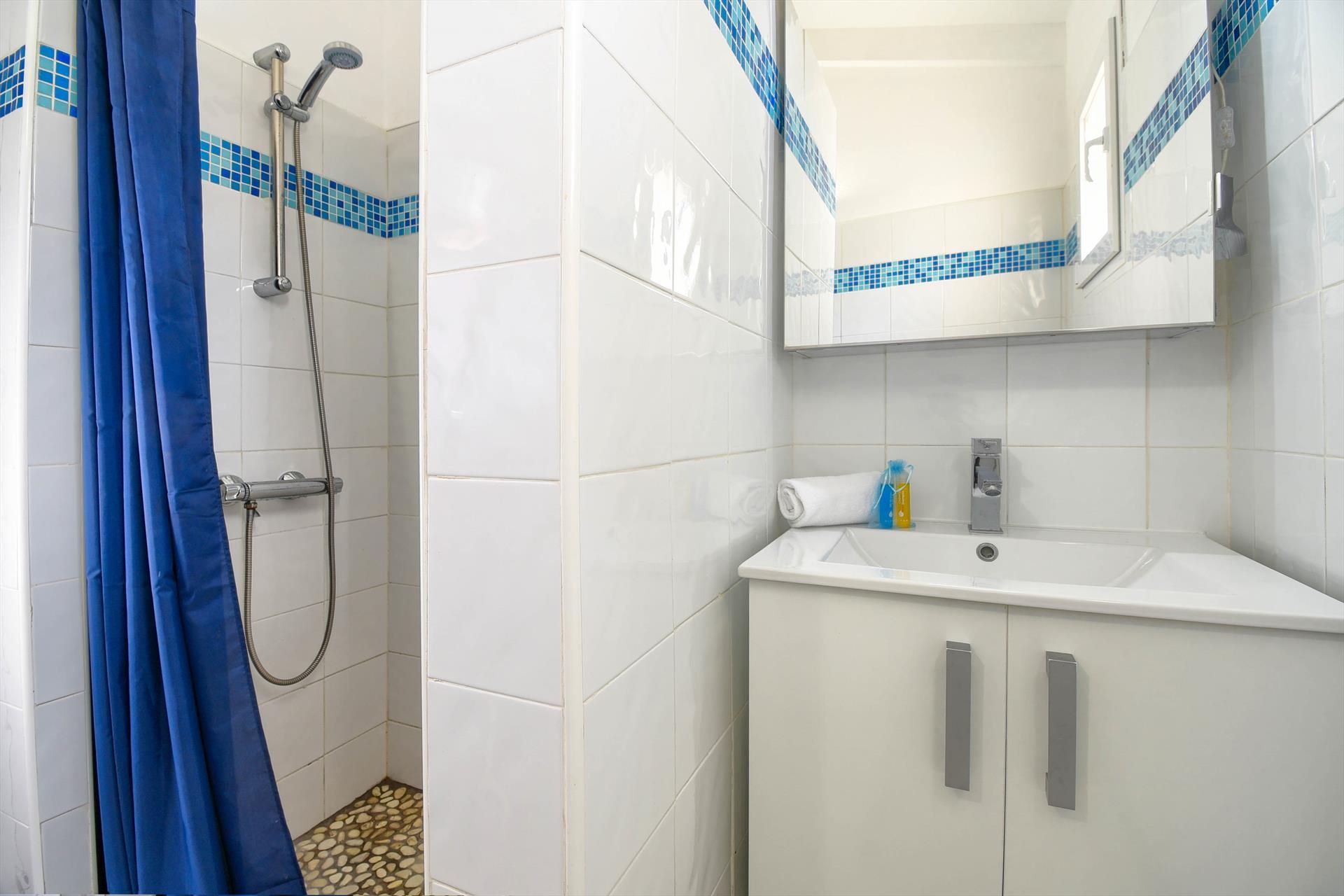 • salle de bain avec lavabo simple, douche, toilette et sèche-cheveux