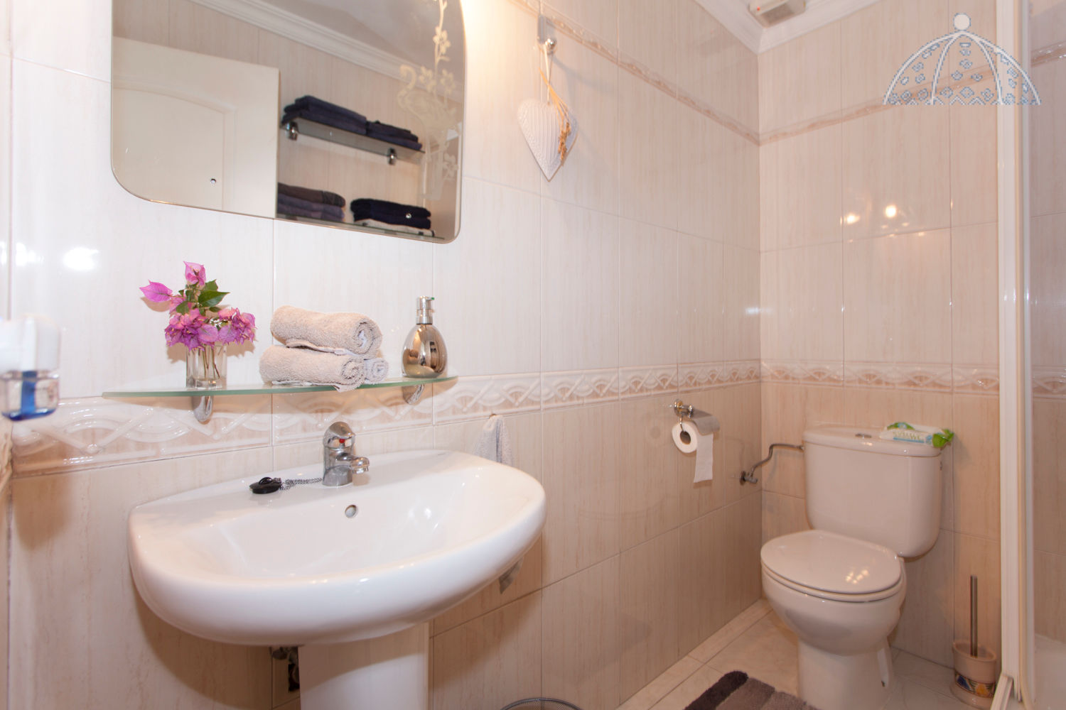 • badkamer met enkele wastafel, douche en toilet