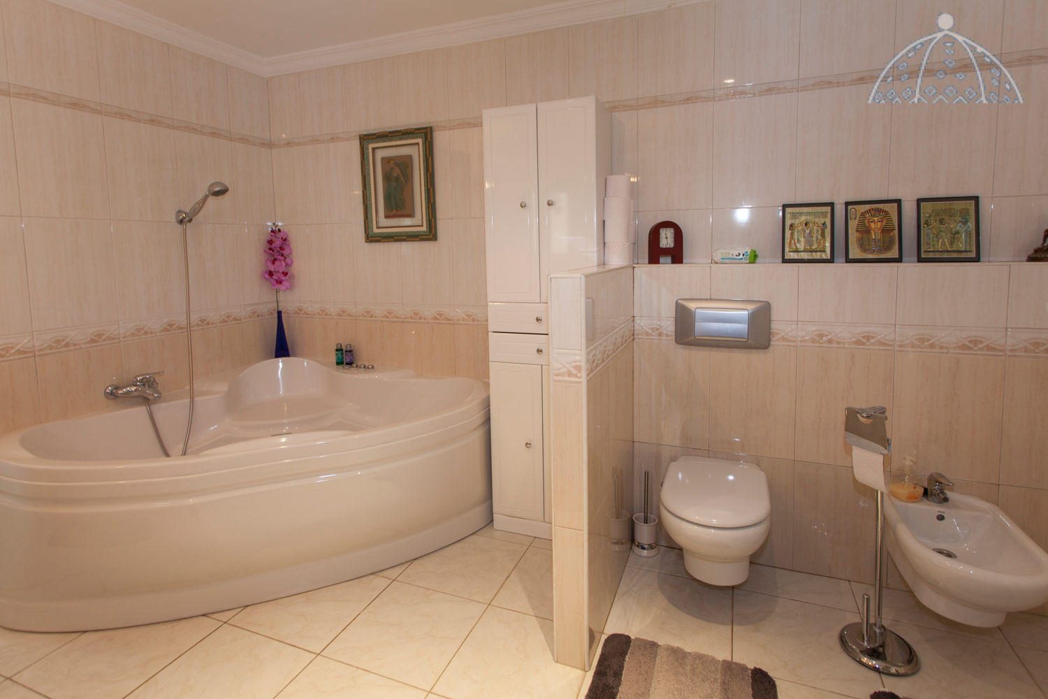 • en-suite badkamer met dubbele wastafel, bad, douche, bidet en toilet