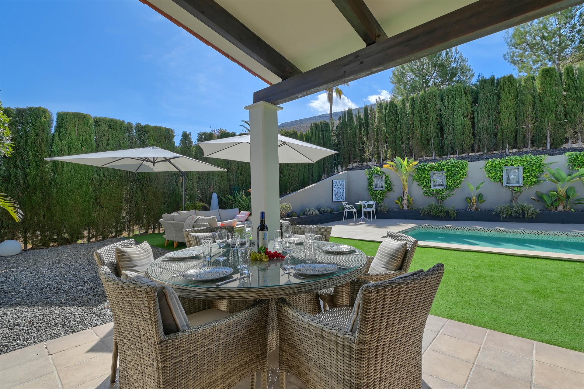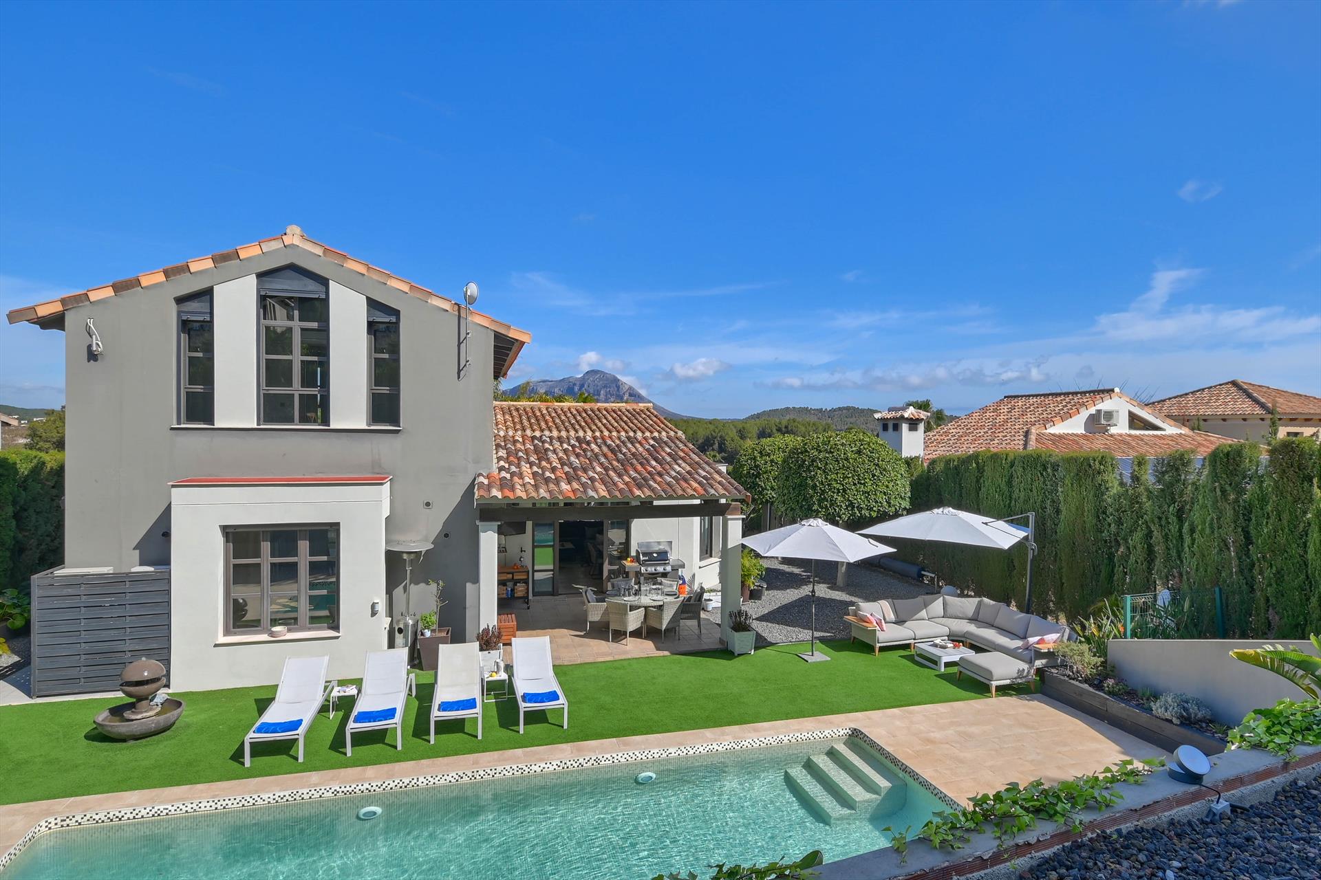 Grote en gezellige villa met privézwembad in Jávea, Costa Blanca, Spanje voor 6 personen. Het huis bevindt zich in een residentiële strandwijk en op 3 km van Benitachell.